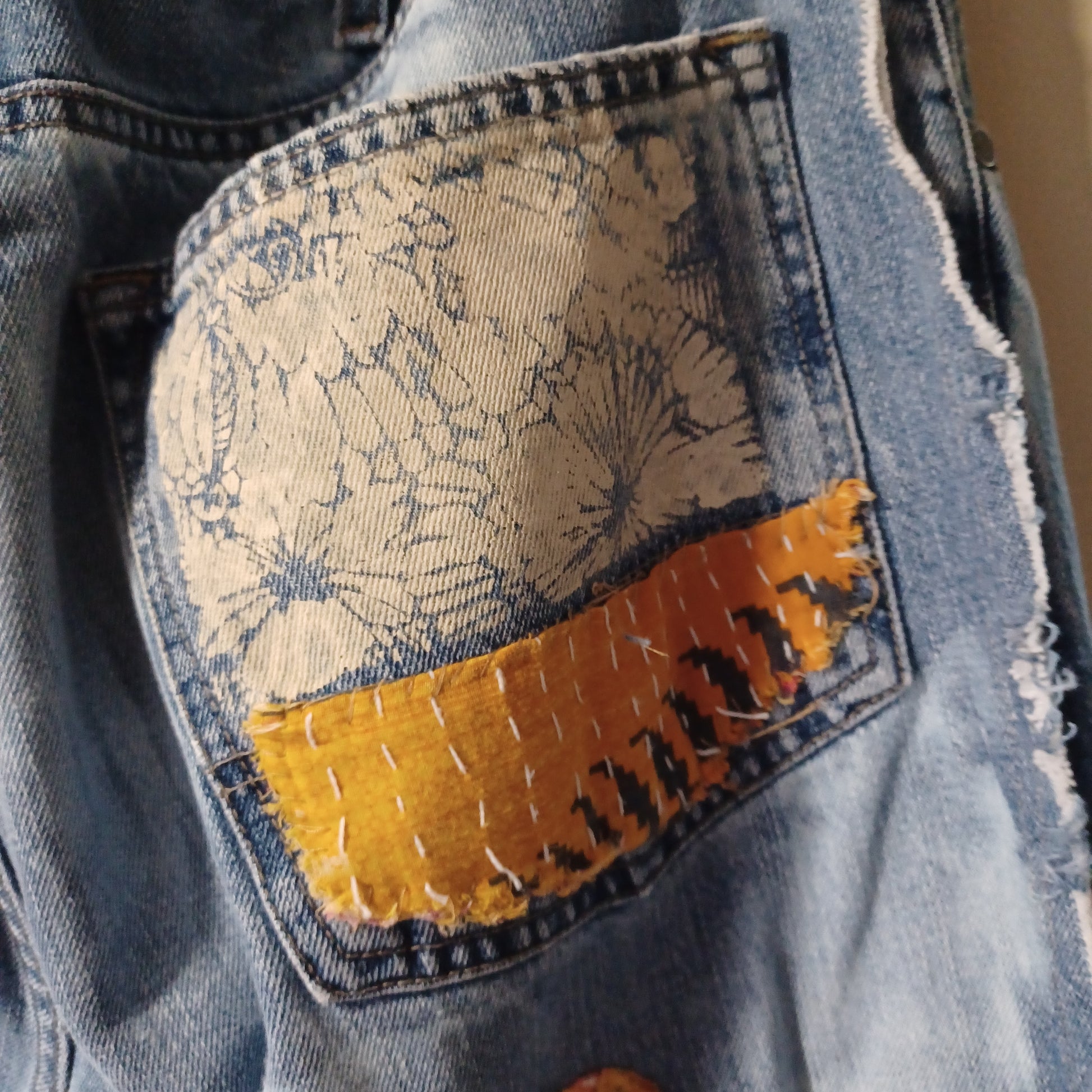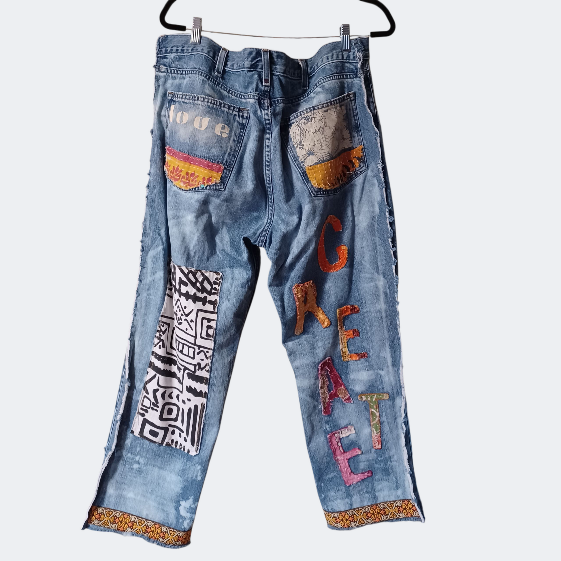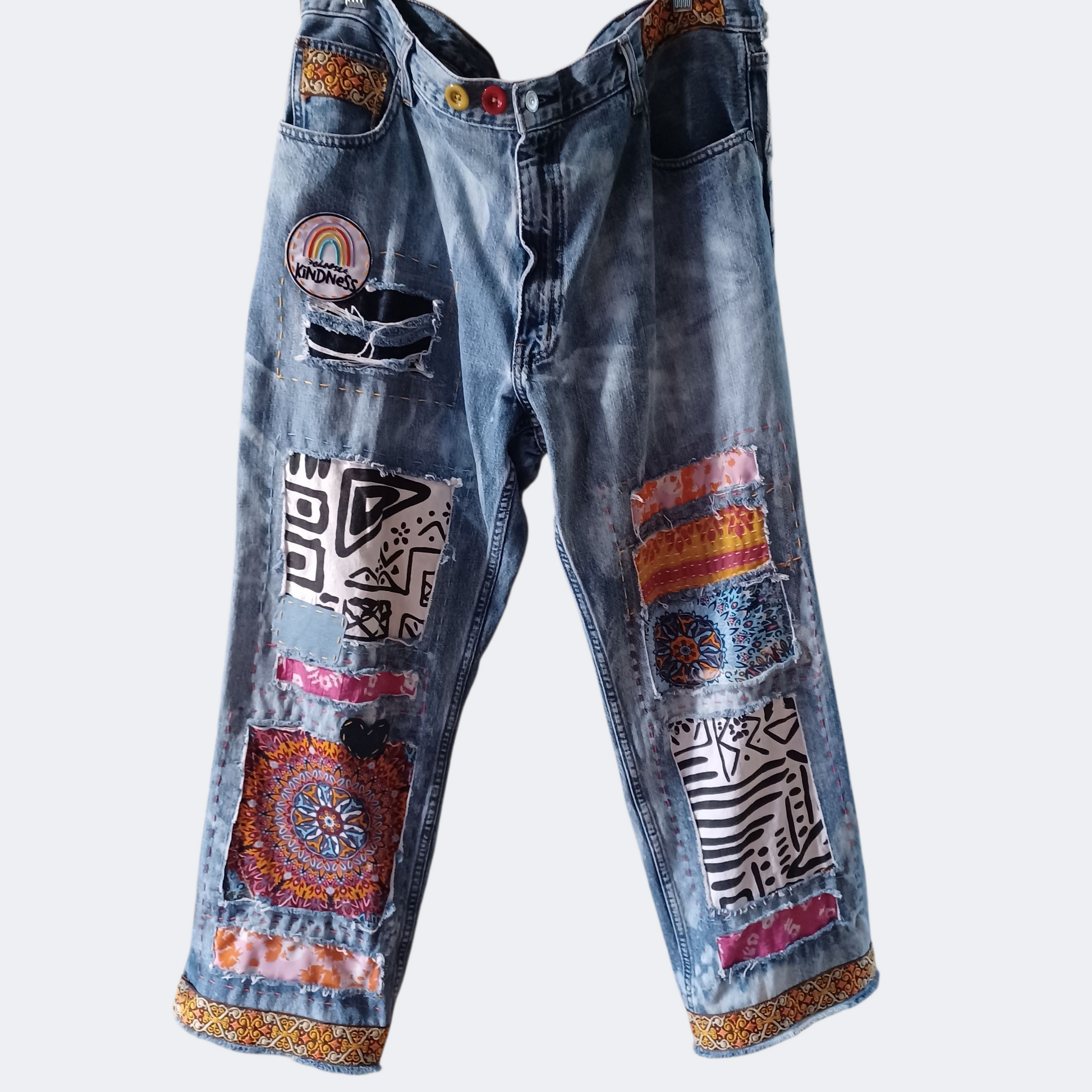 Upcycled men's jeans, see detailed measurements below. These jeans are meant to have an oversized look, the waistband has 3 buttons to adjust fit if you are smaller. The outside leg seams have been cut open to help with ease of sewing with my artistic designs. They are sewn closed with flat edges to allow for a desired frayed look. All seams are double stitched for durability. The jeans will continue to fray with washing but can be trimmed for your desired look. Jeans have been distressed, spot- bleached, patched, and painted, the paint has been heat set for longevity. Hems have been cut to fray and have an added awesome trim. Measurements: waist 20".....outside seam 40".....inseam 28". CARE INSTRUCTIONS: Hand or machine wash gentle cycle, cold water. Line dry, put in dryer while pants still slightly damp on gentle spin, low temp to soften fabric. Remember to remove any attached vintage pins before washing and drying. Can also be dry cleaned. Each pair of jeans comes with a boho belt as a thank you.