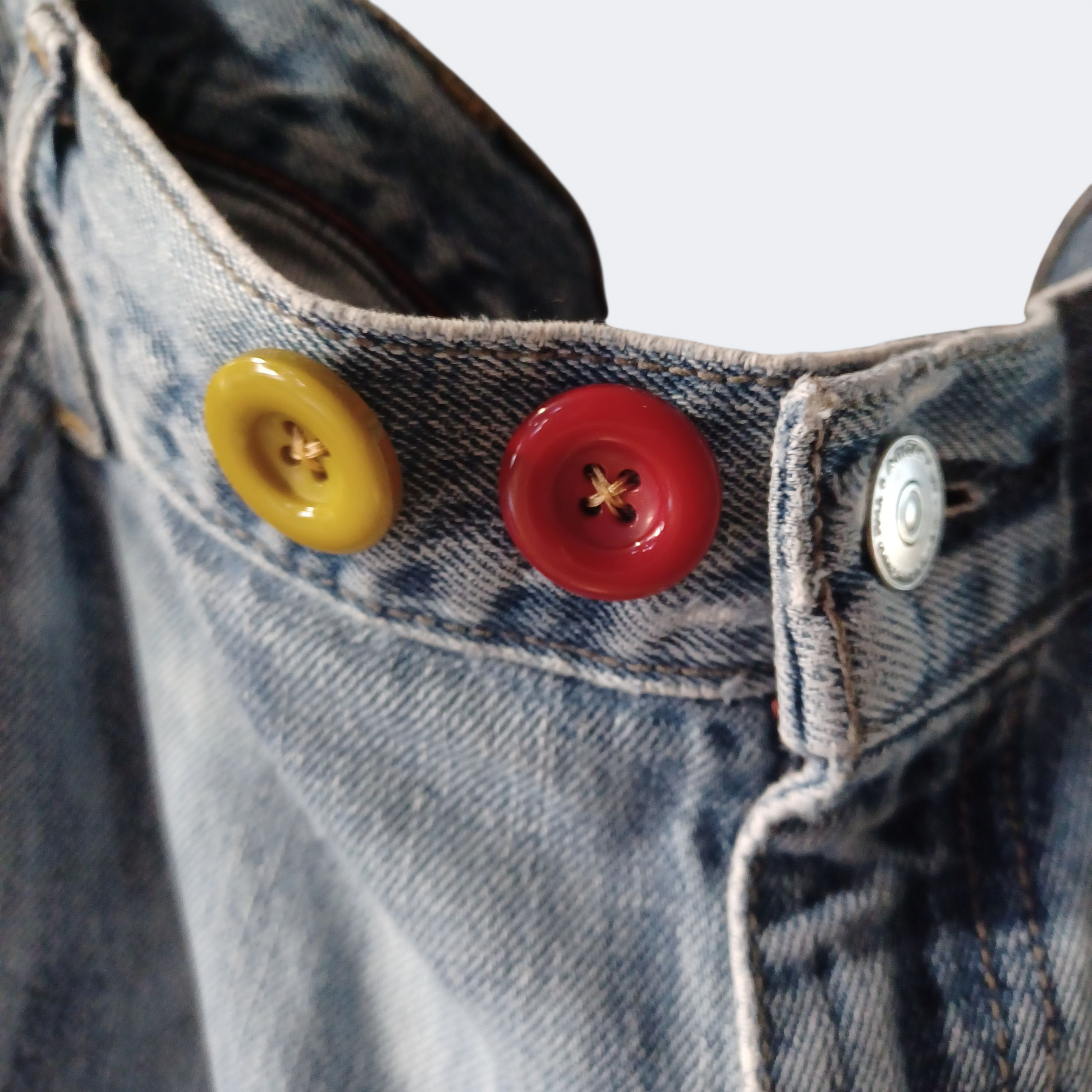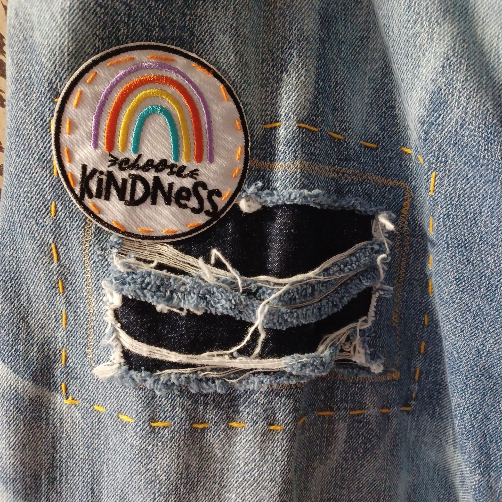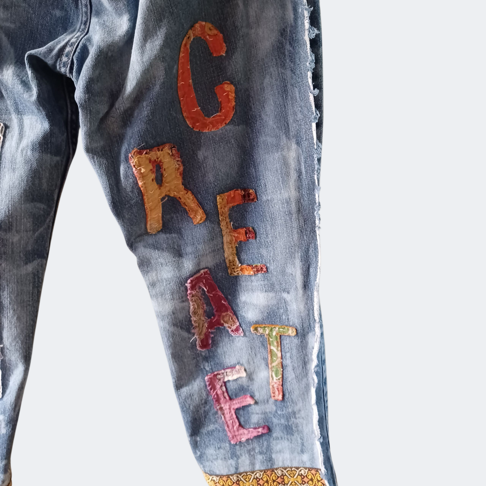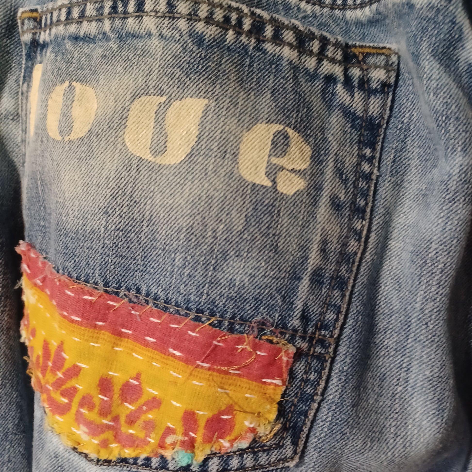 Upcycled men's jeans, see detailed measurements below. These jeans are meant to have an oversized look, the waistband has 3 buttons to adjust fit if you are smaller. The outside leg seams have been cut open to help with ease of sewing with my artistic designs. They are sewn closed with flat edges to allow for a desired frayed look. All seams are double stitched for durability. The jeans will continue to fray with washing but can be trimmed for your desired look. Jeans have been distressed, spot- bleached, patched, and painted, the paint has been heat set for longevity. Hems have been cut to fray and have an added awesome trim. Measurements: waist 20".....outside seam 40".....inseam 28". CARE INSTRUCTIONS: Hand or machine wash gentle cycle, cold water. Line dry, put in dryer while pants still slightly damp on gentle spin, low temp to soften fabric. Remember to remove any attached vintage pins before washing and drying. Can also be dry cleaned. Each pair of jeans comes with a boho belt as a thank you.